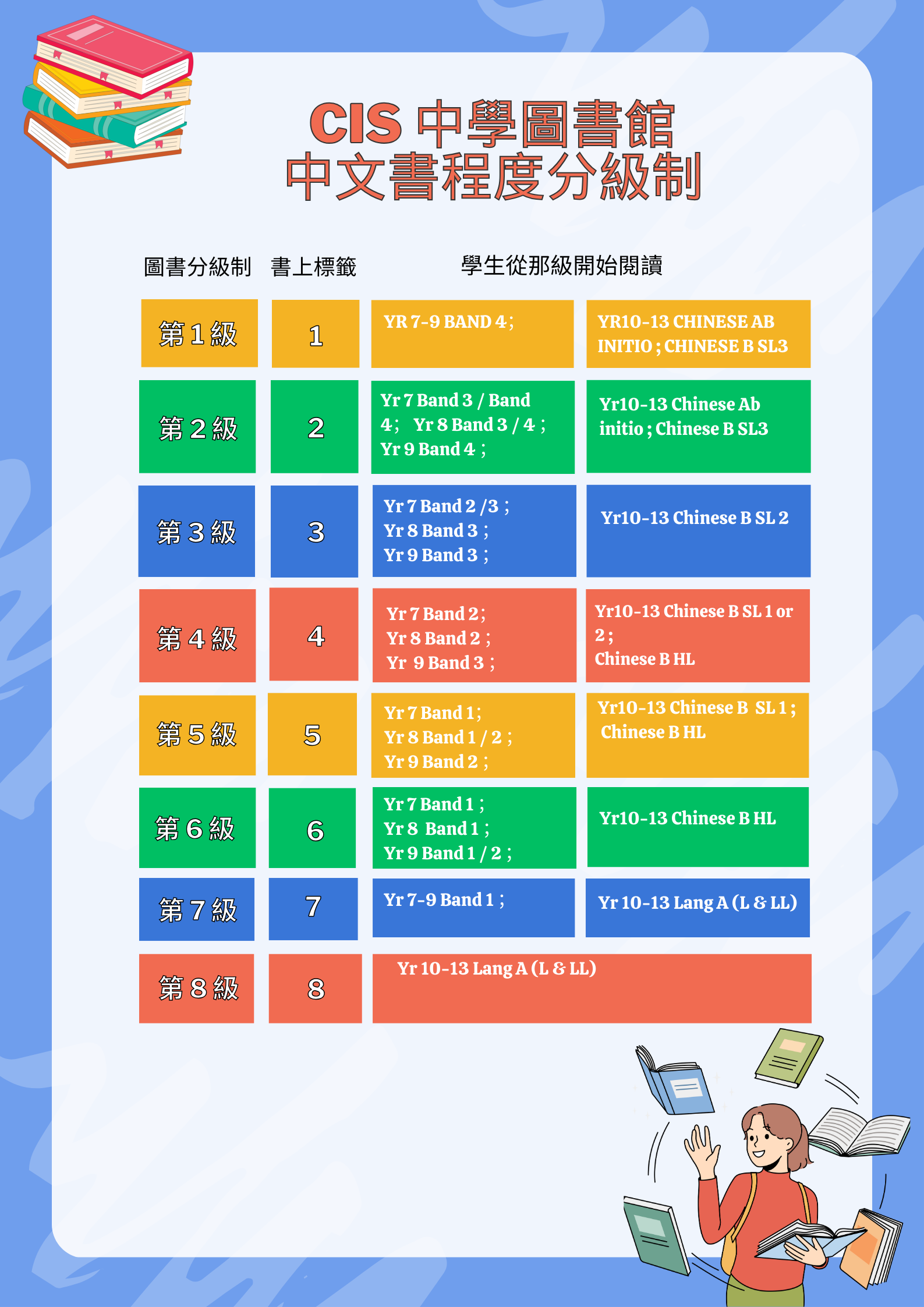 汉基图书馆的中文书籍分类,是依照本校各级中文班的要求为基准。分类标准包括书籍的内容、语文程度以及其格式等要素。学生可用以下图表作参考选出适合自己程度的书籍。